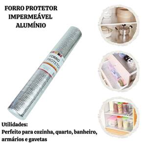 O forro protetor impermeável em alumínio 45x300cm é uma solução prática e durável para proteger superfícies de cozinha, como prateleiras, gavetas, e fogões, contra respingos, umidade, gordura e sujeira. Feito com material de alumínio resistente e impermeável, é fácil de limpar e mantém a área protegida e higiênica. Este forro protetor é ideal para manter a cozinha organizada, protegida e livre de resíduos, além de contribuir para uma maior durabilidade das superfícies.