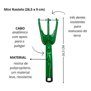 Mini Rastelo (26,5 x 9 cm) – Ideal para pequenos serviços, conta com três dentes resistentes para preparo do solo e cabo anatômico com apoio para o polegar.