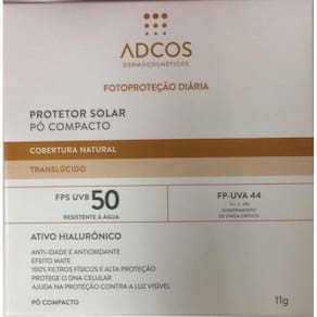 Fotoprotetor pó compacto hialuronico fps 50 translúcidoO protetor solar pó compacto fps 50 com ativo hialurônico é um protetor solar em pó composto de filtros 100% físicos, com ação anti-idade para peles normais, mistas e oleosas. Possui ácido hialurônico em sua composição, que proporciona hidratação profunda e prolongada, preenchendo as rugas e linhas através desse ativo. É ideal para reaplicação ao longo do dia, pois possui cobertura natural com efeito mate e controle de oleosidade.Protetor solar em pó com ácido hialurônico e fps 50 que possui potente ação antioxidante, hidratante e antienvelhecimento. Protege dos raios uva, uvb, infravermelho e luz visível com alto fator de proteção solar, composto 100% de filtros minerais com 5 tonalidades diferentes e uma versão translúcida. Possui embalagem prática, portátil e ideal para reaplicação da fotoproteção ao longo do dia, conferindo a pele efeito mate e antibrilho, mantendo a pele protegida a qualquer hora do dia dos raios solares e da luz visível.O protetor solar fps 50 pó compacto da adcos possui textura seca, super leve e cobertura natural, que pode ser transformada em alta cobertura quando aplicado em camadas. É o protetor solar em pó ideal para reaplicação durante o dia.O ativo hialurônico presente na fórmula deste pó compacto com protetor solar proporciona alta hidratação, imediata e em longo prazo, além de potencializar o tratamento antienvelhecimento e reduzir rugas e linhas de expressão através da hidratação.Possui ainda vitamina e, potente antioxidante e antienvelhecimento que atua como um escudo protetor, prevenindo o dano celular ao inibir a formação de radicais livres e conferir hidratação à pele. Esse protetor solar em pó contém também uma associação de sílicas e partículas, responsáveis por proporcionar à pele efeito mate e controle de oleosidade.- com ativo hialurônico, que hidrata e promove ação anti-idade- preenche rugas e linhas por hidratação- 100% filtros físicos- cobertura natural- reposição e reforço da fotoproteção ao logo do dia- efeito mate e antibrilho com ação antioxidante- disfarça imperfeições da pele- controla a oleosidade- protege o dna celular- resistente à água e oil-free- ajuda na proteção contra a luz visível- sem parabenos- dermatologicamente testado- hipoalergênico- não comedogênico- contém fragrância e corantePara escolher a melhor tonalidade do protetor solar pó compacto fps 50 com ativo hialurônico, segue indicação de acordo com o tom da pele:- translúcido - promove uma cobertura mais natural, suave e leve por possuir mínima quantidade de tonalizante. (se adapta a uma maior variedade de tons de pele).- ivory: tonalidade bege muito claro, creme de baunilha.- peach: tonalidade bege claro, pêssego.- nude: tonalidade bege médio, amêndoa.- beige: tonalidade bege escuro, caramelo.- bronze: tonalidade marrom, canela.Modo de usar:Aplique abundantemente o protetor solar pó compacto fps 50 com ativo hialurônico antes da exposição ao sol. Se a quantidade aplicada não for adequada, o nível de proteção será significativamente reduzido.É necessária a reaplicação desse protetor solar em pó com ácido hialurônico para manter a sua efetividade. Reaplicar sempre, após sudorese intensa, nadar ou banhar-se, secar-se com toalha e durante a exposição ao solPrincípios ativos:- ativo hialurônico: promove hidratação intensiva e prolongada, deixa a pele macia, previne o envelhecimento, preenche rugas e linhas de expressão através da hidratação.- filtros minerais: dióxido de titânio, óxido de zinco, proteção contra raios uva e uvb, protege contra a luz visível e previne o câncer de pele.- vitamina e: ação antioxidante, antienvelhecimento, hidratante, protege o dna celular e as células contra a radiação solar.- sílicas e partículas antibrilho: absorve a oleosidade da pele, antibrilho, pele mate e disfarça as imperfeições.