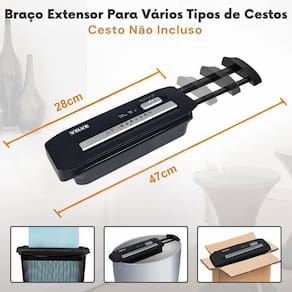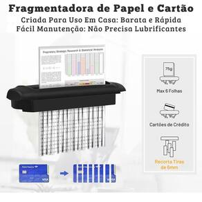 Corte em tiras de 6mm segurança no descarte ; Tritura até 6 folhas por vez; Fragmenta papel, cartões e grampos metálicos; Não fragmenta CDs ou clips metálicos; Adaptável em lixeiras de 28cm a 47cm de largura; Dimensões: 32 x 12 x 8cm; Peso: 1,3kg.