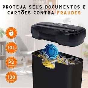 Corte em tiras de 6mm segurança no descarte ; Tritura até 6 folhas por vez; Lixeira de descarte de 9 litros; Fragmenta papel, cartões e grampos metálicos; Não fragmenta CDs ou clips metálicos; Dimensões: 33 x 29 x 15cm; Peso: 1,5kg.