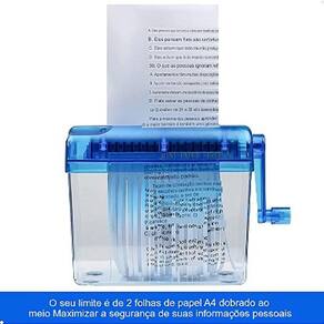 Portátil e fácil de usar Não necessita de eletricidade, sendo uma opção econômica Design transparente para monitoramento do processo Fragmenta papel em tiras finas para maior segurança Ideal para pequenos volumes de papel Perfeita para uso doméstico ou em pequenos escritórios Marca: Lorben Modelo: WST-123 Material: Plástico ABS Cor: Transparente/Azul Entrada de papel: 123mm Largura do corte: 3mm Capacidade: Até 2 folhas de papel A4 dobradas ao meio