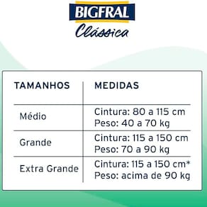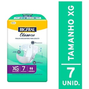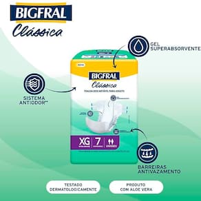 Fralda Descartável Bigfral Clássica - Extra Grande (7 Unidades) A Fralda Descartável Bigfral Clássica foi especialmente desenvolvida para proporcionar conforto e segurança em cada dia. Com tamanho Ext
