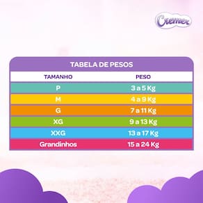 •        Camada superabsorvente que distribui rápido o xixi pela fralda e evita o retorno do líquido, garantindo que a pele do bebê fique sempre bem sequinha;