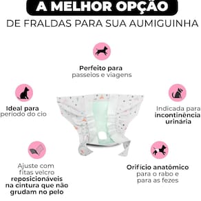 Fralda Descartável para Cães Fêmeas Tamanho M com 12 unidades Dog's Care A Fralda Higiênica Dog's Care possui Liberdade e Praticidade, dentro e fora de casa, para nossos Pets e para nós. São extremamente confortáveis e anatômicas, resolvem o problema de urina fora do lugar, ou fora de hora, em viagens, passeios no parque, no carro e em locais fechados. Indicado para o xixi, possuem costura anti-vazamento, orifício anatômico para o rabo, para as fezes, elástico de ponta a ponta, manta super absorvente com gel em flocos que garantem de 6 a 8 horas de absorção do xixi e fitas de “fecho aderente” para proporcionar um melhor ajuste para a fêmea. FECHO EM fecho aderente AJUSTÁVEL: Feitas exclusivamente para cães fêmeas, as fraldas descartáveis Dog’s Care possuem fecho em fitas de fecho aderente reposicionáveis que não grudam nos pelos, oferecem fácil colocação e ajuste na cintura. Ideais para passeios e viagens, trazem tranquilidade para você e liberdade para a sua amiguinha de quatro patas. CONFORTO ANATÔMICO: Desenvolvida exclusivamente para xixi, com orifício para a cauda e saída das fezes, possui formato anatômico que deixa livre o movimento das patinhas, as fraldas são indicadas para cachorrinhas de todas as idades, que estejam nos períodos de cio ou pós-cirúrgico, que sofram de incontinência urinária ou demarcação de território, proporcionando um ajuste perfeito e uso prolongado (+ de 8 h) sem assaduras e desconforto. ABSORÇÃO EFICIENTE: Fabricadas com exclusiva tecnologia BLOCK GEL e barreiras anti vazamento, as fraldas possuem tecnologia de rápida absorção que dura mais de 8 horas, promovem proteção contra o vazamento de xixi fora de hora e lugar. HIPOALERGÊNICA: Produzidas com os mesmos cuidados das fraldas de bebê, as fraldas Dog’s Care são esterilizadas para máxima higiene e segurança durante o uso, evitando irritações e sendo uma ótima opção para pets com pele sensível.
