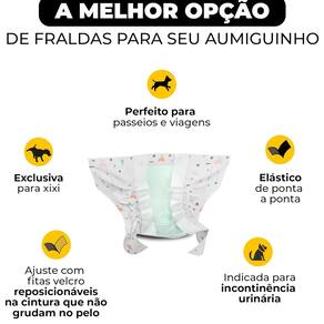Fralda Descartável para Cães Machos Tamanho M com 06 unidades Dog's Care \nA Fralda Dog's Care para Cães Machos possui formato anatômico de faixa absorvente, manta super absorvente com gel em flocos que garantem de 6 a 8 horas de absorção (depende do fluxo de urina) e fitas reposicionáveis para proporcionar melhor ajuste; Esterilizada para evitar proliferação de fungos e bactérias evitando assaduras e alergias, proporciona mais conforto, não incomoda o escroto e as patas do animal; Exclusiva para xixi, indicada para donos que não abrem mão da companhia do amigo pet e sofrem com a demarcação de território, evitando, assim, o estrago de móveis e utensílios dentro de casa e maiores constrangimentos em passeios e viagens, ou quando o pet já está velhinho e sofre com a incontinência urinária. O produto é indicado também para os cães no pós operatório e que não fazem xixi no lugar certo. \nQuando as fraldas nos salvam?\nEm casos de demarcação de território Quando ela estiver no cio Quando ele insiste em fazer xixi fora do lugar Na visita na casa da vovó, da dinda para ele não fazer xixi por todo canto Casos de incontinência urinária Quando ele já estiver bem velhinho Depois de algum procedimento cirúrgico Para um passeio tranquilo e sem sujeiras! DIFERENCIAIS: Elástico de ponta a ponta; Fitas fecho aderente para melhor ajuste na cintura e não grudar no pelo; Esterilizada para evitar a proliferação de fungos e bactérias evitando assaduras e alergias.