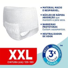 Características Adicionais: Desenvolvida para absorver e controlar fluxos intensos, garantindo conforto Proporciona ajuste adequado ao corpo, oferecendo mais segurança Conta com ação antiodor, ajudando na discrição durante o uso Oferece maciez e bem-estar ao usuário em qualquer situação Indicada para adultos que necessitam de proteção íntima prolongada Produto ideal para casos de incontinência urinária severa