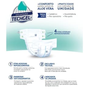 Barreiras anti-vazamentos e quatro fitas adesivas reposicionáveis permitem abrir e fechar conforme necessário, para ajuste perfeito ao corpo do usuário.