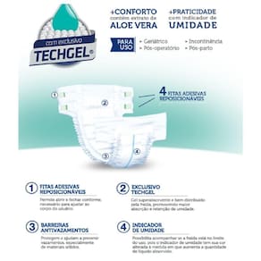 Barreiras anti-vazamentos E quatro fitas adesivas reposicionáveis permitem abrir e fechar conforme necessário, para ajuste perfeito ao corpo do usuário.