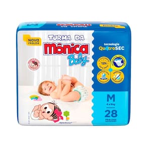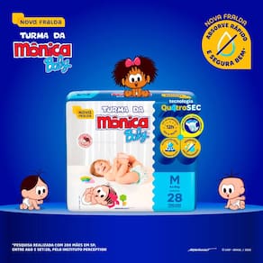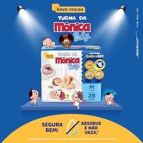 Fralda Infantil Turma da Mônica Baby Jumbo Tamanho M A Turma da Mônica Baby uniu proteção e conforto em uma nova opção de fralda, para garantir que seu bebê cresça feliz e tenha as melhores lembranças da sua infância. A Nova fralda Turma da Mônica Baby possui a nova Tecnologia QuatroSec para que ele fique calmo, tranquilo e seguro durante o dia e a noite toda. Conta com um exclusivo sistema de canais que distribui mais rápido o xixi, barreiras anti-vazamento e uma fina camada extra que ajuda a manter o bebê sequinho por até 12 horas, além de cintura elástica que proporciona um perfeito ajuste no corpinho. A Nova fralda Turma da Mônica Baby possui a nova Tecnologia QuatroSec; com um exclusivo sistema de canais que distribui mais rápido o xixi, barreiras anti-vazamento e uma fina camada extra que ajuda a manter o bebê sequinho por até 12 horas, além de cintura elástica que proporciona um perfeito ajuste no corpinho. A Turma da Mônica Baby é uma marca de excelência no mercado de fraldas infantis há mais de 25 anos. A marca e sua turma estão presentes no coração dos brasileiros há mais de 3 gerações, e agora também faz parte do portfólio da Ontex. Os novos produtos foram pensados e elaborados para as mamães e os papais que, assim como nós, valorizam a tradição e os valores culturais aprendidos na infância, alinhado com o conforto e a qualidade dos produtos Turma da Mônica para seu bebê. Modo de uso: 1. Coloque o bebê sobre a fralda aberta com as fitas na parte traseira. 2. Abra as fitas agarradinhas e ajuste a fralda no corpinho do bebê posicionando as fitas sobre a faixa frontal branca.