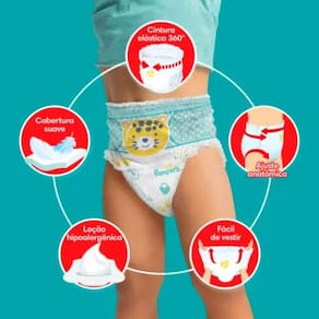 Pampers Pants Ajuste Total com cintura elástica 360° se adapta ao corpinho do bebê para um ajuste perfeito para Até ZERO vazamentos*. A fralda calça Pampers Pants Ajuste Total é fácil de vestir e de trocar.