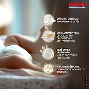 Fralda Premium Huggies Natural Care RN 34 Unidades A Huggies Natural Care Premium para recém nascidos é a escolha ideal para a proteção máxima da pele do seu bebê, incluindo o cuidado especial com o cordão umbilical. Com um corte umbilical integrado, evitamos atrito com o umbigo do bebê. A cobertura macia e respirável proporciona conforto extra, cuidando delicadamente desde os primeiros momentos. Além disso, oferece um toque suave como algodão e tecnologia avançada para uma sensação de sempre sequinho. Hipoalergênica e sem parabenos, a Huggies Natural Care foi pensada para proteger a pele do seu bebê contra assaduras por até 12 horas, com uma tecnologia especialmente desenvolvida para a melhor absorção de cocô líquido, sem vazamentos. Os elásticos na cintura proporcionam mais liberdade de movimento, garantindo uma experiência completa de cuidado e conforto. MODO DE USO 1) Abra a fralda e as orelhas traseiras e levante as barreiras. Coloque o bebê e verifique se a fralda está cobrindo suas costas até a cintura; 2) Descole as orelhas e fixe-as sobre a faixa frontal da fralda, ajustando-as de acordo com o corpinho do bebê. Quando a orelha chegar ao ícone passante, mude para um tamanho maior; 3) Ajuste o elástico das pernas para garantir que não dobre por cima das barreiras internas; 4) Enrole a fralda e prenda-a, utilizando as orelhas ajustáveis. Descartar as fraldas utilizadas no lixo, nunca no vaso sanitário.