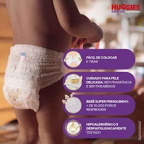 Fralda Roupinha Huggies Natural Care Tamanho G Pacote Hiper 60 Unidades Descartáveis A Huggies Fralda Roupinha Natural Care é a escolha ideal para a proteção máxima da pele do seu bebê. Com um cuidado