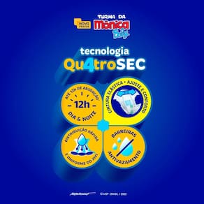 A Fralda Turma da Mônica Baby conta com a Tecnologia Qu4troSec para que ele fique calmo, tranquilo e seguro durante o dia e a noite toda.