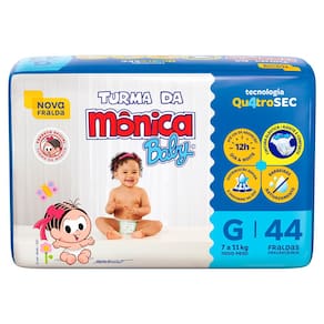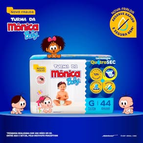 Fralda Infantil Turma da Mônica Baby Mega Tamanho G A Turma da Mônica Baby uniu proteção e conforto em uma nova opção de fralda, para garantir que seu bebê cresça feliz e tenha as melhores lembranças da sua infância. A Nova fralda Turma da Mônica Baby possui a nova Tecnologia QuatroSec para que ele fique calmo, tranquilo e seguro durante o dia e a noite toda. Conta com um exclusivo sistema de canais que distribui mais rápido o xixi, barreiras anti-vazamento e uma fina camada extra que ajuda a manter o bebê sequinho por até 12 horas, além de cintura elástica que proporciona um perfeito ajuste no corpinho. A Nova fralda Turma da Mônica Baby possui a nova Tecnologia QuatroSec; com um exclusivo sistema de canais que distribui mais rápido o xixi, barreiras anti-vazamento e uma fina camada extra que ajuda a manter o bebê sequinho por até 12 horas, além de cintura elástica que proporciona um perfeito ajuste no corpinho. A Turma da Mônica Baby é uma marca de excelência no mercado de fraldas infantis há mais de 25 anos. A marca e sua turma estão presentes no coração dos brasileiros há mais de 3 gerações, e agora também faz parte do portfólio da Ontex. Os novos produtos foram pensados e elaborados para as mamães e os papais que, assim como nós, valorizam a tradição e os valores culturais aprendidos na infância, alinhado com o conforto e a qualidade dos produtos Turma da Mônica para seu bebê. Modo de uso: 1. Coloque o bebê sobre a fralda aberta com as fitas na parte traseira. 2. Abra as fitas agarradinhas e ajuste a fralda no corpinho do bebê posicionando as fitas sobre a faixa frontal branca.