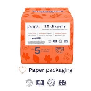 Fraldas ecológicas Pura Size 5 (24-35 libras), totalmente isentas de cloro (TCF), hipoalergênicas, algodão orgânico macio, conforto sustentável, 12 horas de proteção contra vazamentos, alergia no Reino Unido, 1 pacote com 20 fraldas