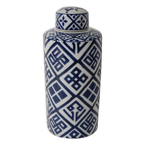 Jarra Benjara com tampa de 14 polegadas, padrão geométrico, porcelana cilíndrica azul e branca