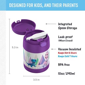 Thermos Tat Frasco infantil isolado a vácuo com colher, 283 g, aço inoxidável, Frozen 2 - Permanece quente ou frio: a tecnologia de isolamento a vácuo THERMOS retém a temperatura de refeições quentes ou frias. Envie-os para a escola com sua sopa favorita ou lanche frio. Este pote de comida mantém o conteúdo quente por até 5 horas e frio por até 7 horas - Durável para uso diário: a estrutura de aço inoxidável 18/8 de alta qualidade é construída para lidar com quedas, amassados e ásperos variados - Design amigável para crianças: leve e compacto com uma tampa de botão para que seja fácil de carregar e abrir. A boca larga é fácil de encher, comer e limpar. Você pode colocar seu pote de comida FUNTAINER na máquina de lavar louça, embora seja recomendado lavar à mão - Colher incluída: não há necessidade de embalar uma colher separada! Este pote de comida tem um que se dobra convenientemente para armazenar dentro da tampa - Proteja o que você ama: este equipamento THERMOS KIDS é feito com materiais duráveis e laváveis na lava-louças, destinados a manter o almoço e as bebidas como eles gostam. O quebra-cabeça da hora do almoço está oficialmente resolvido