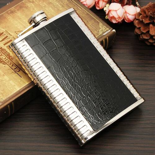 Material: Aço inoxidável + leatherColor: Preto + SilverCapacity: 9OZHeight: 14.5cm / 5.71 ''Superfície lisa designPortable, muito fácil de transportar e tomar sua bebida favorita
