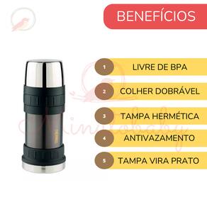 Nunca mais se preocupe em esquecer os utensílios! Acompanhando o frasco, uma colher dobrável acoplada à tampa está sempre pronta para uso. A tampa externa ainda serve como prato, permitindo dividir porções com facilidade.