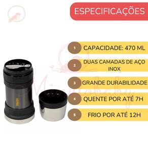 Material: Aço inoxidável Capacidade: 470ml Tempo de Retenção: Frio: 12 horas Quente: 7 horas (Obs.: Pode variar conforme o uso) Cor: Cinza Peso: 580g Dimensões: 24cm x 9cm x 9cm (A x L x P)
