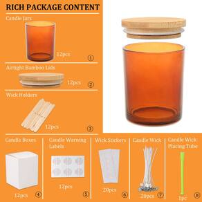 Conteúdo da embalagem: ? 12 frascos de vidro de 295 ml; ? 12 tampas herméticas de bambu. ? 20 pavios de vela de 15 cm, ? 20 adesivos de pavio de vela, ? 20 suportes de pavio, ? 12 etiquetas de aviso de vela, ? 12 caixas de vela, ? 1 tubo de colocação de pavio de vela, ? 12 etiquetas de velas perfumadas personalizadas. tornando o processo de fabricação de velas mais conveniente e fácil. Um ótimo custo-benefício! - ?? Compre e você receberá: 12 frascos de vidro âmbar com tampas herméticas de bambu, 20 pavios de vela de 15 cm, 20 adesivos de pavio de vela, 20 suportes de pavio, 12 etiquetas de aviso de vela, 12 caixas de vela, 12 tubos de colocação de pavio de vela, 12 etiquetas de velas perfumadas personalizadas proporcionando uma ótima área individualizada para escrever a fragrância que você empacotou e seu nome. tornando o processo de fabricação de velas mais conveniente e fácil. Um ótimo custo-benefício! - ?? Grande capacidade e fácil de limpar: jarra de vela de vidro de 295 ml, medindo 8 cm de diâmetro e 9 cm de altura, este frasco de vidro sem tampas pode encher até 283 g. Se quiser com tampas e espaço reservado para pavimentos. sugerimos 200 ml, é o perfeito. Os frascos de fabricação de velas podem ser lavados na lava-louças e são fáceis de limpar à mão. - ?? Origem da natureza: tampas de bambu com design hermético. Os frascos vazios para velas vêm com tampas de bambu, as tampas de bambu com os ilhós de vedação de borracha são super para manter aromáticos e saborosos. para adicionar ao toque caseiro, ele vem com etiquetas adesivas que você escreve em si mesmo. - ?? Multiuso: estes frascos de vela de vidro âmbar com tampas são projetados principalmente para organização e armazenamento. Feitos de vidro grosso e perfeitos para fazer velas e armazenar uma variedade de alimentos como café, geleia, alimentos secos, flores secas, ervas, especiarias, nozes, folhas de chá, etc. pode ser aplicado como recipientes para pós como sal, açúcar, pomadas, sais de banho, óleo essencial, cosméticos, coleção, farinha, loção corporal, slime ou outros artesanatos. as tampas herméticas de bambu não as protegem contra exposição ao ar. - ?? Compra sem risco: o design de caixa de pacote antiquebra para estes frascos de vela de vidro os torna uma baixa taxa de danos no transporte. a embalagem foi muito boa. Qualquer frasco em falta ou dano , devolução ou reembolso .