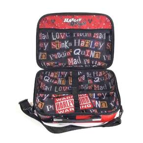 A Frasqueira Maleta Harley Quinn Pequena é ideal para viagens e passeios com charme. Material impermeável e com sistema de absorção de impactos, com alça de ombro e alça de mão.