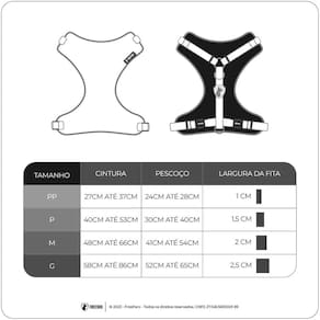 Feito em neoprene, modela-se perfeitamente ao corpo do pet;É o peitoral mais seguro, pois prende-se ao corpo do animal em 2 pontos (pescoço e cintura);Tira em Poliéster super macio e resistente, é a mesma utilizada em cintos de segurança;Tecnologia inTransfer® garante a estampa com cores mais vivas;100% ajustável ao corpo do animal (verifique a tabela e tamanhos);TAMANHO P Cintura - 40cm até 53cm Pescoço - 30cm até 40cm Largura da fita - 1,5cm