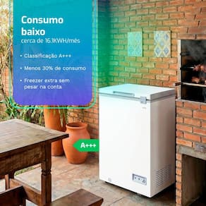 O Freezer HQ-100CFX se destaca na categoria compacta com consumo aproximado de 16,12kWh/mês, isso significa custo fixo reduzido para quem mantém o freezer ligado o ano todo, seja em casa ou como apoio em um pequeno negócio.