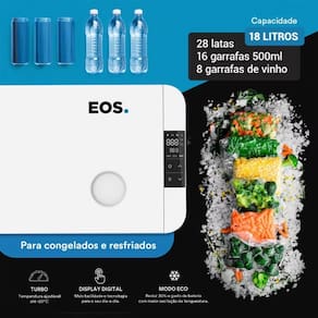 Ficha Técnica Voltagem Quadrivolt - 110V / 220V ou 12V / 24V Modelo EFC20 Fabricante EOS Acessórios inclusos Acompanha cabos para ligação Capacidade Líquida 18 Litros Categoria Freezers Com Indicador de Carga Da Bateria (Quando Ligado à Bateria) Cor Branco Código Frigelar B189949 Degelo Automático Sim Degelo Manual Não Display Digital Faixa de Temperatura (ºC) '-20ºC a +20ºC Frost Free Não Garantia 12 meses Mantém Alimentos Por Até 4 Horas Após Desligado Medida (LxAxP/cm) 57 x 29,5 x 32cm Modo Eco Sim Modo Turbo Sim Nível de Ruído 45dB Orientação Horizontal Painel Painel Touch Peso Líquido (Kg) 10,7kg Potência 50 W Proteção de Bateria Desliga Para Evitar Descarregar a Bateria do automóvel Tipo Portátil Tipo de Porta Cega Volume Útil 18 Litros
