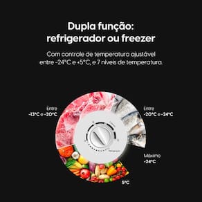 Disponível em três capacidades (99L, 142L ou 199L) nas tensões 110V e 220V, ele se adapta ao seu espaço e à sua necessidade, garantindo armazenamento inteligente e prático. O controle de temperatura varia de -24°C a +5°C, permitindo utilizá-lo tanto como refrigerador quanto como congelador, e armazenar desde carnes e frios até bebidas e sorvetes.