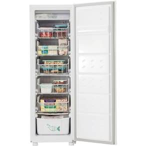 Especificacoes Tecnicas: Classificacao energetica: A. Consumo aproximado de energia: 36,5 KWh/mes Compartimento Extra Frio: 1 Congelamento rapido: Nao Porta reversivel: Nao Armazenamento liquido: 142 l Capacidade bruta: 166 l Cestos deslizantes e removiveis: 5 Funcao: Freezer Informacoes de uso na porta: Sim Nao contem CFC: Sim Pes: 4 Portas: 1 Prateleiras: Nao Rodizios para transporte: Sim Tipo de degelo: Manual Tipo de freezer: Vertical Gavetao: 1
