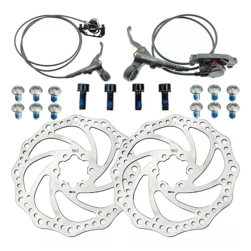 Itens inclusos: 2 - Manetes de freio. 2 - Mangueiras de óleo de freio 2 - Pares de pastilhas 2 - Pinças de Freio 2 - Discos de Freio de 160mm 16 - Parafusos
