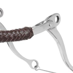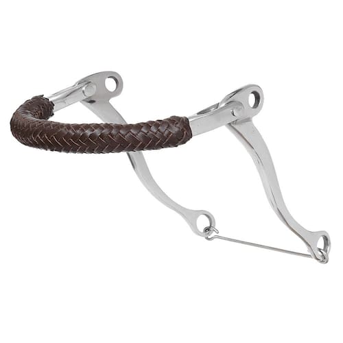 Freio Hackmore importado, fabricado com hastes longas em alumínio, com chanfro revestido em couro trançado, ferramenta bastante utilizada em animais sensíveis a embocaduras tradicionais. A ação desta ferramenta esta localizada entre o chanfro e a barbela.