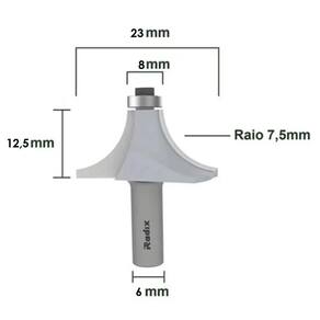 Fresa tm gr:19 r07,5 h6mm s/rol cordao de janela - 19r7.50.01 A fresa gr:19 r07,5 h6mm sem rolamento da radix foi desenvolvida especialmente para a usinagem de detalhes ornamentais, como acabamentos de cordão em janelas e móveis. Ideal para marceneiros exigentes, essa ferramenta entrega precisão, acabamento refinado e durabilidade superior. Seu design côncavo com raio de 7,5 mm permite criar perfis suaves e decorativos com alto padrão visual. Produzida com metal duro widea de alta resistência, é indicada para uso em tupias manuais e de bancada. Características principais: Modelo: gr:19 - perfil decorativo tipo Cordão Raio de corte: 7,5mm - ideal para detalhes curvos e sofisticados Altura de corte h : 6 mm - acabamento superficial com controle fino Sem rolamento: para uso com guia ou gabarito Aplicação: madeira maciça, mdf, compensado e outros derivados : ideal para marcenarias, indústrias moveleiras e artesãos de alta precisão Acabamento refinado: bordas limpas e detalhadas sem queimar a madeira Especificações: Marca: radix Modelo: gr:19 cordão de janela Tipo de fresa: perfil decorativo - sem rolamento Material: metal duro widea Raio do corte r : 7,5 mm Altura de corte: 6 mm Diâmetro do corte: aproximado conforme geometria gr:19 Diâmetro do haste: 6 mm compatível com tupias de haste 6mm Aplicação: madeira, mdf, mdp, compensados Acabamento: suave, côncavo, estilo cordão Código interno: gr:19 r07,5 h6mm s/rol