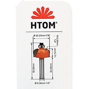 Fresa Moldura Arredondada com Rolamento 7/8 Haste 1/4 Metal Duro Profissional HTOMFresa com Rolamento e Dentes de Metal Duro HTOM. Indicada para acabamentos laterais em madeira e derivados, utilizada em tupias de qualquer marca com pinça de 1/4 Pol.- Marca: HTOM- Referência: HTOM-42469- Diâmetro do corte: 7/8 Pol. 22,23 mm- Diâmetro da Haste: 1/4 Pol.- Raio: 1/4 Pol.- Comprimento total: 50mm- Fresa com dentes de metal duro- Indicada para acabamentos laterais em madeira e derivados, utilizada em tupia- Possui 2 dentes de vídea/metal duro, conferindo maior durabilidade- Garantia: 90 dias