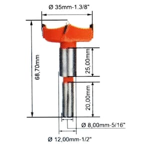Fresa Para Dobradiça Caneco 35Mm Forstner Meta Duro Para Tupia Fresa Broca Forstner 35mm para Dobradiça Caneco Meta Duro Vídea Uso em Tupia HTOM Fresa com dente de vídea/metal haste 8mm diâmetro 35mm duro tipo Forstner indicada para trabalhos em madeira e derivados na colocação de dobradiças tipo caneco. - Marca: HTOM - Referência: HTOM-42473 - Diâmetro do corte: 35mm - Haste: 8mm - Comprimento total: 68,7mm - Fresa dobradiça tipo caneco 35 mm com 2 dentes - Verifique todas as dimensões da fresa nas fotos do anúncio - Fresa com dente de vídea/metal duro indicada para trabalhos em madeira e derivados na colocação de dobradiças tipo caneco - Indicado para isso com tupia - Possui 2 dentes de vídea/metal duro, conferindo maior durabilidade - Dentes em Metal Duro HSS para Marcenaria - Produto de Grande durabilidade - : 90 dias Marca: Não Informado