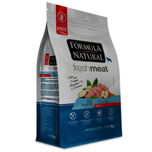 Fórmula Natural Fresh Meat Cães Filhotes Médio oferece todos os cuidados para um ótimo desenvolvimento dos cães filhotes de porte médio, do desmame até 12 meses de idade.