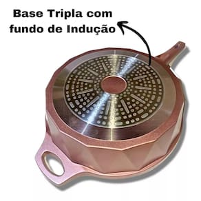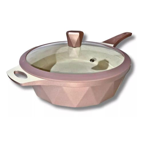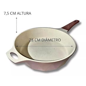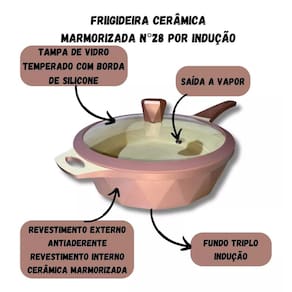 *Frigideira 28 cm Antiaderente Cerâmico Marmorizado Fundo Triplo para Indução com, tampa de vidro temperado com Saída de vapor; *Alumínio Injetado com fundo triplo por indução de alta qualidade, espessura de 5 mm, que confere ao item uma estrutura resistente garantindo a durabilidade e distribuição eficiente do calor; *Revestido com Antiaderente externamente, e internamente com Cerâmica Marmorizada *Possui cabo reforçado, feito em baquelite, material antitérmico que não retém calor, para garantir máxima segurança no manuseio; *Revestimento externo: Antiaderente - Cor Rosê; *Revestimento interno: Cerâmica Marmorizada - Cor Bege.