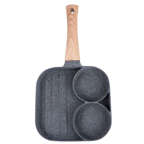 Frigideira 3 em 1 Panela Antiaderente para Ovo Hambúrguer e Carne Características: A superfície interna da frigideira é tratada com revestimento antiaderente, proporcionando facilidade e higiene. Materiais de alta qualidade selecionados, alta resistência à temperatura, resistência ao desgaste e longa vida útil. Aquecimento uniforme, pode ajudá-lo a preparar um delicioso café da manhã rapidamente. Possui um furo no cabo para armazenamento.