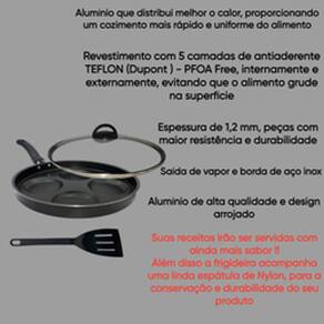 Seja bem-vindo a Coisas & Trecos   Nossa Missão Oferecer uma experiência de compra, agradável, divertida e inspiradora   Garantir a satisfação total dos nossos clientes, entregando produtos de qualidade e excelência no atendimento.   Quer um toque especial para sua casa? Então entre e sinta-se à vontade, conheça, nossa variedade de produtos, criativos, de alta qualidade e originalidade.   Recomendamos que leia o detalhamento da oferta e a descrição do produto desejado. Tenha a tranquilidade de comprar com quem está disposto a te oferecer, o melhor suporte e atendimento de excelência. Nossa equipe de pós venda está à disposição para te auxiliar e esclarecer eventuais dúvidas.   Especificações do Produto   A Arte de Misturas Sabores... Cozinhar é a arte de misturar sabores e encantar, é na cozinha que a mágica acontece, que os amigos se reúnem, que as alegrias se multiplicam... Beleza, charme, praticidade na hora de cozinhar, você vai se encantar, sua cozinha merece esse mimo!   Frigideira 4 em 1 Multiuso com Divisória Antiaderente faz Ovos e Hamburgers, acompanha tampa de vidro temperado com Saída de vapor, o que permite visualizar o processo de cozimento dos alimentos. Design arrojado, beleza e muito charme, o diferencial desse Item, está em seu material, alumínio de alta qualidade, espessura de 1,1 mm, que confere ao item uma estrutura resistente garantindo a durabilidade e distribuição eficiente do calor, proporcionando o cozimento mais rápido e uniforme dos alimentos. Revestido com 5 camadas de antiaderente TEFLON (DuPont) - PFOA Free, internamente e externamente, evitando que o alimento grude na superfície, o que possibilita o preparo dos alimentos com menos gordura, além de proporcionar praticidade no momento da limpeza. Possui cabo reforçado ergonômico, feito em baquelite, material antitérmico que não retém calor, para garantir facilidade e máxima segurança no manuseio.   Especificações Técnicas:   Dimensões aproximadas - cm: (Altura x Largura x Comprimento - Capacidade volume): Frigideira 24 cm de diâmetro - 2,5 x 28 x 40 – 1,5 L   Material: Alumínio Revestido Revestimento Externo: Antiaderente Revestimento Interno: Antiaderente Espessura Material: 1,1 mm Tampa: Tampa de Vidro Temperado Cabo: Baquelite Peso Frigideira: 821 g Dimensões aproximadas da embalagem (AxLxP): 41 x 28 x 8 cm Embalagem: Saco Plástico / Caixa Parda   Recomendações: Antes do primeiro uso é necessário realizar a limpeza e a cura do item, imprescindível para durabilidade e proteção da camada antiaderente. Lave com esponja macia e detergente neutro, seque-a com um pano limpo. Unte a parte interna com óleo ou outra gordura e leve-a ao fogo baixo por 2 minuto. Deixe-a esfriar, lave, enxugue e está pronta para utilizar.   Cuidados: - Para conservação e durabilidade do seu produto lavar somente om lado macio da esponja; - Evite a imersão do produto quente em água fria. Sempre o deixe esfriar antes de lavar; - Para mexer os alimentos use somente utensílios de silicone ou nylon; - Não exponha as alças e cabos diretamente ao fogo ou fonte de calor prolongado; - Não pode ser levada ao forno e/ou microondas; - Mantenha o produto sobre a chama do fogão apenas o necessário para o cozimento, sempre em fogo baixo ou médio (nunca superior a 350°C).   Detalhes: - Garantia 30 dias contra defeitos de fabricação. - Itens decorativos não acompanham o produto. Imagens meramente ilustrativas - Para descarte dos produtos e embalagens siga as orientações de reciclagem vigente.   Estamos à disposição para qualquer dúvida. Agradecemos a sua visita e aguardamos seu pedido!   Atenciosamente Equipe Coisas & Trecos