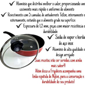 Cozinhar é a arte de misturar sabores e encantar, é na cozinha que a mágica acontece, que os amigos se reúnem, que as alegrias se multiplicam .... Beleza, charme, praticidade na hora de cozinhar, você vai se encantar por essas Frigideiras, sua cozinha merece esse mimo! Frigideira Alta 20 cm Antiaderente Com tampa de vidro, item indispensável na sua cozinha, produzido com alumínio de alta qualidade, espessura de 1,1 mm, peça com maior resistência e durabilidade, alumínio que distribui melhor o calor, proporcionando um cozimento mais rápido e uniforme do alimento, Frigideira Revestidas com 5 camadas de antiaderente TEFLON (DuPont) - PFOA Free, internamente e externamente, evitando que o alimento grude na superfície, o que facilita no preparo dos alimentos e proporciona praticidade no momento da limpeza. Possui cabo com espaçador metálico, feito em baquelite, um material antitérmico, que não retém calor, contribuindo para um manuseio mais confortável e seguro. Além disso, a frigideira acompanha uma linda Espátula de Nylon, ideal para a conservação e durabilidade do seu produto!Especificações Técnicas:Dimensões aproximadas - cm: (A x L x C):- 1 Frigideira Alta 20 cm Antiaderente – 5 x 21 x 36 cm- 1 Espátula de Nylon Material: Alumínio RevestidoRevestimento Interno: Antiaderente Teflon Pro-FlonRevestimento Externo: Antiaderente Teflon Espessura Material: 1,1mmCabo: BaqueliteTampa: Vidro com borda de Aço InoxPeso: 285 gPeso Embalagem: 170 gEmbalagem: Saco Plástico / Caixa PardaDimensões aproximadas da embalagem (AxLxP): 5 x 25 x 36 cmCuidados:- Antes de usar pela primeira vez, lave com esponja macia, detergente neutro, depois de secar, unte a área interna com óleo e aqueça em fogo baixo por 1 minuto. Deixe esfriar é só lavar e seu produto está pronto para uso, sempre em fogo baixo ou médio (nunca superior a 350°C);- Ideal para fogão a gás, elétrico e vitrocerâmico com resistência elétrica;- Para mexer os alimentos use somente utensílios de silicone ou nylon;- Nunca utilize solventes, objetos cortantes ou abrasivos e ou pontiagudos;- Mantenha o produto sobre a chama do fogão apenas o necessário para o cozimento;- Não exponha as alças e cabos diretamente ao fogo ou fonte de calor prolongado;- Não pode ser levada ao forno e/ou microondas;- Evite a imersão do produto quente em água fria. Sempre o deixe esfriar antes de lavar;- Para maior durabilidade do produto recomenda-se secar bem antes de guardar.Informações do Fabricante: Coisas & Trecos possui 18 anos de experiência no mercado de alumínio e utensílios para casa. A Coisas & Trecos tem como norte o desenvolvimento com estreitas e duradouras parcerias com fabricantes e fornecedores, com o objetivo de entregar aos seus clientes produtos de qualidade.Garantia do fornecedor: 30 dias contra defeitos de fabricação.Detalhes:- Com Antiaderente Teflon PFOA Free, que garante a ausência de elementos nocivos à saúde em sua composição- Ao comprar sua Frigideira Alta 20 cm Antiaderente, você receberá em seu endereço: 01 Frigideira 20 cm de diâmetro, na cor escolhida no ato da compra e uma Espátula. - Itens decorativos não acompanham o produto. Imagens meramente ilustrativas (a cor do produto pode sofrer alteração de acordo com a qualidade do monitor).- Para descarte dos produtos e embalagens siga as orientações de reciclagem vigente.Estamos à disposição para qualquer dúvida. Agradecemos a sua visita e aguardamos seu pedido!