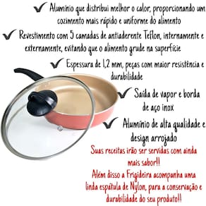 Cozinhar é a arte de misturar sabores e encantar, é na cozinha que a mágica acontece, que os amigos se reúnem, que as alegrias se multiplicam .... Beleza, charme, praticidade na hora de cozinhar, você vai se encantar por essas Frigideiras, sua cozinha merece esse mimo! Frigideira Alta 20 cm Antiaderente Com tampa de vidro, item indispensável na sua cozinha, produzido com alumínio de alta qualidade, espessura de 1,1 mm, peça com maior resistência e durabilidade, alumínio que distribui melhor o calor, proporcionando um cozimento mais rápido e uniforme do alimento, Frigideira Revestidas com 5 camadas de antiaderente TEFLON (DuPont) - PFOA Free, internamente e externamente, evitando que o alimento grude na superfície, o que facilita no preparo dos alimentos e proporciona praticidade no momento da limpeza. Possui cabo com espaçador metálico, feito em baquelite, um material antitérmico, que não retém calor, contribuindo para um manuseio mais confortável e seguro. Além disso, a frigideira acompanha uma linda Espátula de Nylon, ideal para a conservação e durabilidade do seu produto!Especificações Técnicas:Dimensões aproximadas - cm: (A x L x C):- 1 Frigideira Alta 20 cm Antiaderente – 5 x 21 x 36 cm- 1 Espátula de Nylon Material: Alumínio RevestidoRevestimento Interno: Antiaderente Teflon Pro-FlonRevestimento Externo: Antiaderente Teflon Espessura Material: 1,1mmCabo: BaqueliteTampa: Vidro com borda de Aço InoxPeso: 285 gPeso Embalagem: 170 gEmbalagem: Saco Plástico / Caixa PardaDimensões aproximadas da embalagem (AxLxP): 5 x 25 x 36 cmCuidados:- Antes de usar pela primeira vez, lave com esponja macia, detergente neutro, depois de secar, unte a área interna com óleo e aqueça em fogo baixo por 1 minuto. Deixe esfriar é só lavar e seu produto está pronto para uso, sempre em fogo baixo ou médio (nunca superior a 350°C);- Ideal para fogão a gás, elétrico e vitrocerâmico com resistência elétrica;- Para mexer os alimentos use somente utensílios de silicone ou nylon;- Nunca utilize solventes, objetos cortantes ou abrasivos e ou pontiagudos;- Mantenha o produto sobre a chama do fogão apenas o necessário para o cozimento;- Não exponha as alças e cabos diretamente ao fogo ou fonte de calor prolongado;- Não pode ser levada ao forno e/ou microondas;- Evite a imersão do produto quente em água fria. Sempre o deixe esfriar antes de lavar;- Para maior durabilidade do produto recomenda-se secar bem antes de guardar.Informações do Fabricante: Coisas & Trecos possui 18 anos de experiência no mercado de alumínio e utensílios para casa. A Coisas & Trecos tem como norte o desenvolvimento com estreitas e duradouras parcerias com fabricantes e fornecedores, com o objetivo de entregar aos seus clientes produtos de qualidade.Garantia do fornecedor: 30 dias contra defeitos de fabricação.Detalhes:- Com Antiaderente Teflon PFOA Free, que garante a ausência de elementos nocivos à saúde em sua composição- Ao comprar sua Frigideira Alta 20 cm Antiaderente, você receberá em seu endereço: 01 Frigideira 20 cm de diâmetro, na cor escolhida no ato da compra e uma Espátula. - Itens decorativos não acompanham o produto. Imagens meramente ilustrativas (a cor do produto pode sofrer alteração de acordo com a qualidade do monitor).- Para descarte dos produtos e embalagens siga as orientações de reciclagem vigente.Estamos à disposição para qualquer dúvida. Agradecemos a sua visita e aguardamos seu pedido!