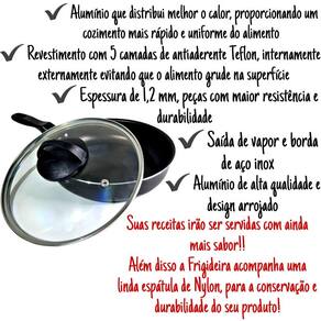 Cozinhar é a arte de misturar sabores e encantar, é na cozinha que a mágica acontece, que os amigos se reúnem, que as alegrias se multiplicam .... Beleza, charme, praticidade na hora de cozinhar, você vai se encantar por essas Frigideiras, sua cozinha merece esse mimo! Frigideira Alta 20 cm Antiaderente Com tampa de vidro, item indispensável na sua cozinha, produzido com alumínio de alta qualidade, espessura de 1,1 mm, peça com maior resistência e durabilidade, alumínio que distribui melhor o calor, proporcionando um cozimento mais rápido e uniforme do alimento, Frigideira Revestidas com 5 camadas de antiaderente TEFLON (DuPont) - PFOA Free, internamente e externamente, evitando que o alimento grude na superfície, o que facilita no preparo dos alimentos e proporciona praticidade no momento da limpeza. Possui cabo com espaçador metálico, feito em baquelite, um material antitérmico, que não retém calor, contribuindo para um manuseio mais confortável e seguro. Além disso, a frigideira acompanha uma linda Espátula de Nylon, ideal para a conservação e durabilidade do seu produto!Especificações Técnicas:Dimensões aproximadas - cm: (A x L x C):- 1 Frigideira Alta 20 cm Antiaderente – 5 x 21 x 36 cm- 1 Espátula de Nylon Material: Alumínio RevestidoRevestimento Interno: Antiaderente Teflon Pro-FlonRevestimento Externo: Antiaderente Teflon Espessura Material: 1,1mmCabo: BaqueliteTampa: Vidro com borda de Aço InoxPeso: 285 gPeso Embalagem: 170 gEmbalagem: Saco Plástico / Caixa PardaDimensões aproximadas da embalagem (AxLxP): 5 x 25 x 36 cmCuidados:- Antes de usar pela primeira vez, lave com esponja macia, detergente neutro, depois de secar, unte a área interna com óleo e aqueça em fogo baixo por 1 minuto. Deixe esfriar é só lavar e seu produto está pronto para uso, sempre em fogo baixo ou médio (nunca superior a 350°C);- Ideal para fogão a gás, elétrico e vitrocerâmico com resistência elétrica;- Para mexer os alimentos use somente utensílios de silicone ou nylon;- Nunca utilize solventes, objetos cortantes ou abrasivos e ou pontiagudos;- Mantenha o produto sobre a chama do fogão apenas o necessário para o cozimento;- Não exponha as alças e cabos diretamente ao fogo ou fonte de calor prolongado;- Não pode ser levada ao forno e/ou microondas;- Evite a imersão do produto quente em água fria. Sempre o deixe esfriar antes de lavar;- Para maior durabilidade do produto recomenda-se secar bem antes de guardar.Informações do Fabricante: Coisas & Trecos possui 18 anos de experiência no mercado de alumínio e utensílios para casa. A Coisas & Trecos tem como norte o desenvolvimento com estreitas e duradouras parcerias com fabricantes e fornecedores, com o objetivo de entregar aos seus clientes produtos de qualidade.Garantia do fornecedor: 30 dias contra defeitos de fabricação.Detalhes:- Com Antiaderente Teflon PFOA Free, que garante a ausência de elementos nocivos à saúde em sua composição- Ao comprar sua Frigideira Alta 20 cm Antiaderente, você receberá em seu endereço: 01 Frigideira 20 cm de diâmetro, na cor escolhida no ato da compra e uma Espátula. - Itens decorativos não acompanham o produto. Imagens meramente ilustrativas (a cor do produto pode sofrer alteração de acordo com a qualidade do monitor).- Para descarte dos produtos e embalagens siga as orientações de reciclagem vigente.Estamos à disposição para qualquer dúvida. Agradecemos a sua visita e aguardamos seu pedido!
