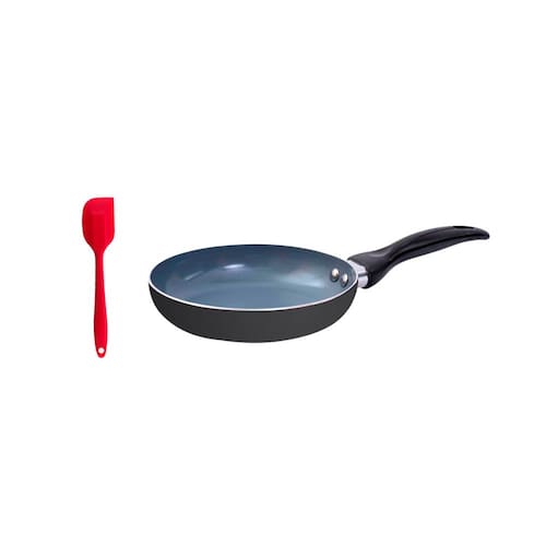 a frigideira é de alumínio, cerâmica e baquelite. a espátula é de silicone.