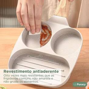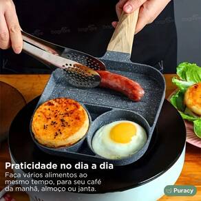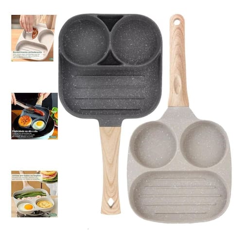 Características Principais: Divisórias Funcionais: As divisórias inteligentemente projetadas permitem que você cozinhe diferentes alimentos simultaneamente sem que eles se misturem. Prepare ovos, hambúrgueres, pães e outros alimentos lado a lado, mantendo seus sabores distintos e preservando a qualidade. Material de Alta Qualidade: Fabricada com materiais de alta qualidade, esta frigideira é durável e resistente a riscos. Sua construção premium garante um cozimento uniforme e eficaz. Fácil de Limpar: A superfície antiaderente facilita a limpeza. Basta passar um pano ou enxaguar sob água morna, e a frigideira estará pronta para o próximo uso.