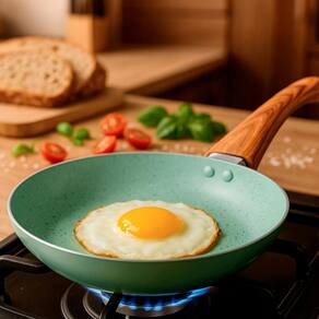 Seu corpo em verde claro fosco traz frescor ao visual da cozinha, enquanto o cabo em baquelite siliconado com acabamento amadeirado entrega conforto térmico e um toque sofisticado. São 22cm de diâmetro, 4cm de altura e 1,4L de capacidade, com espessura de 2mm, perfeita para o dia a dia.