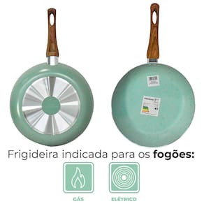 Características: Marca: Casambiente Modelo: Sahara Chama Verde Material da Frigideira: Alumínio Material do Cabo: Baquelite Siliconado (Soft-Touch) Revestimento Interno: Cerâmico Espessura: 2,0mm Cor: Verde Claro Quantidade: 1 peça