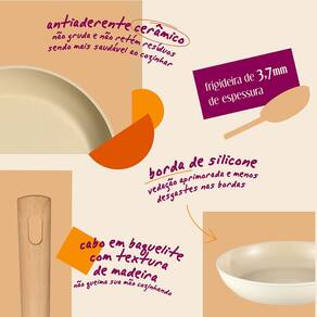 a frigideira tem 3,7mm de espessura na borda e 2,3mm no corpo: distribui melhor o calor e evita que os alimentos queimem. possui 5 camadas: antiaderente cerâmico, camada antidesgaste interna, alumínio, camada antidesgaste externa e pintura externa. também têm uma camada extra de aço inox na base de indução!