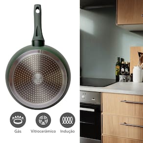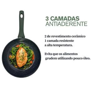 - DESIGN: A frigideira foi projetada em alumínio com revestimento cerâmico, possui um fundo triplo para fogão de indução. Com sua característica antiaderente, diminui a necessidade de usar azeite e óleo. O cabo possui revestimento com tecnologia soft-touch, toque macio e confortável ao segurar, prevenindo acidentes e queimaduras.
